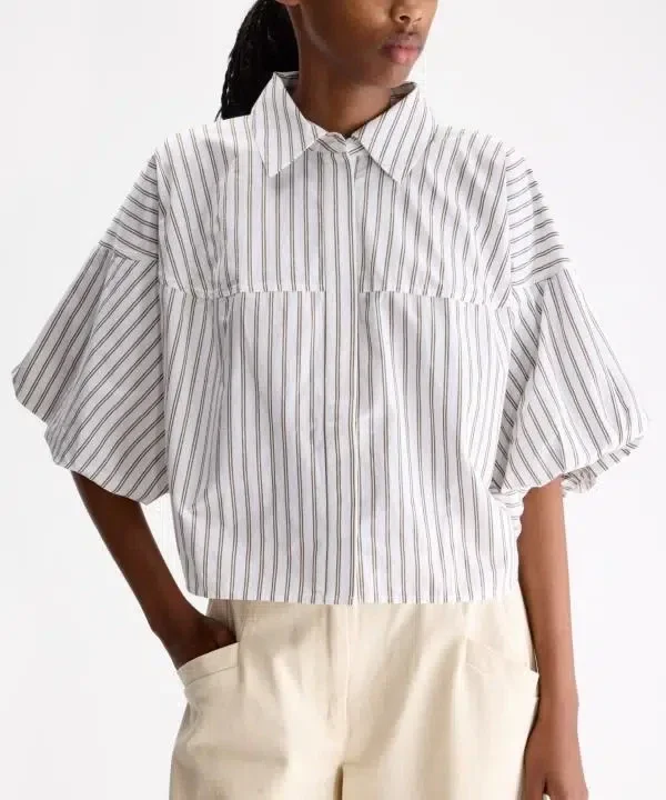 Leuke blouse met korte mouwen en klein streepje. De blouse heeft en kraag en een gepofte mouw