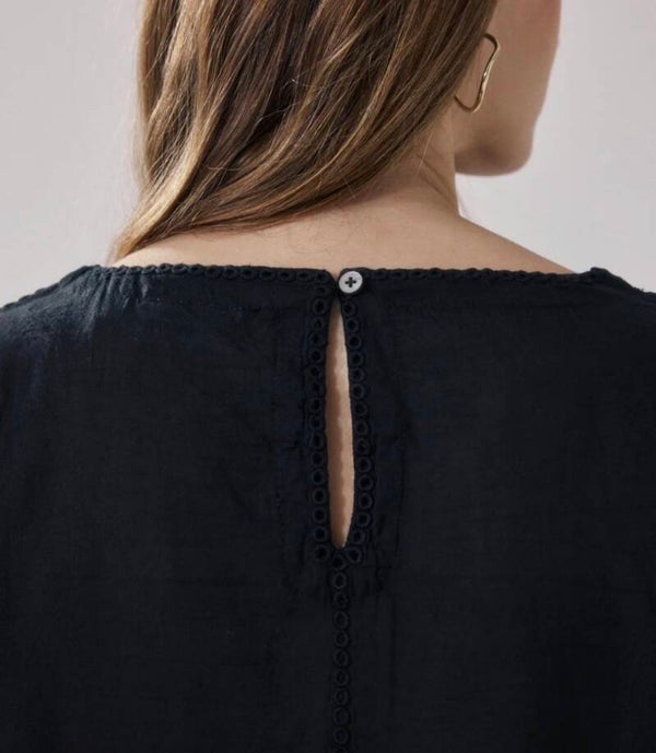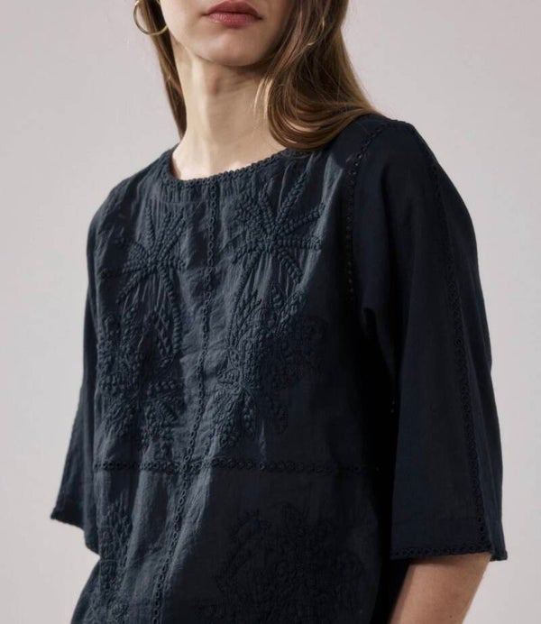 Prachtige blouse met driekwart mouw, ronde hals en mooi borduursel